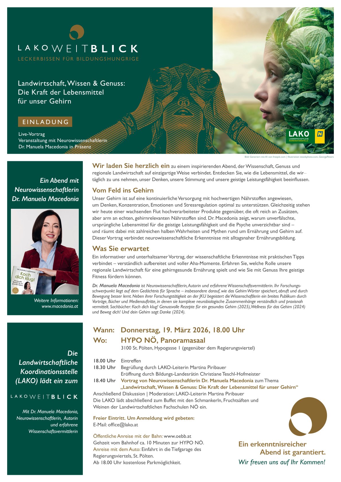 Wie wirkt sich unsere tägliche Ernährung auf Denken, Stimmung und geistige Leistungsfähigkeit aus? Dr. Manuela Macedonia wird darauf eingehen, warum das Gehirn auf hochwertige, natürliche Nährstoffe angewiesen ist und welche Folgen hochverarbeitete Lebensmittel haben können. Neurowissenschaftliche Erkenntnisse werden verständlich erklärt, Ernährungsmythen aufgeklärt und alltagsnahe Impulse gegeben. Zudem wird sichtbar, welche Bedeutung regionale Landwirtschaft für eine gehirngesunde Ernährung und langfristige mentale Fitness hat.